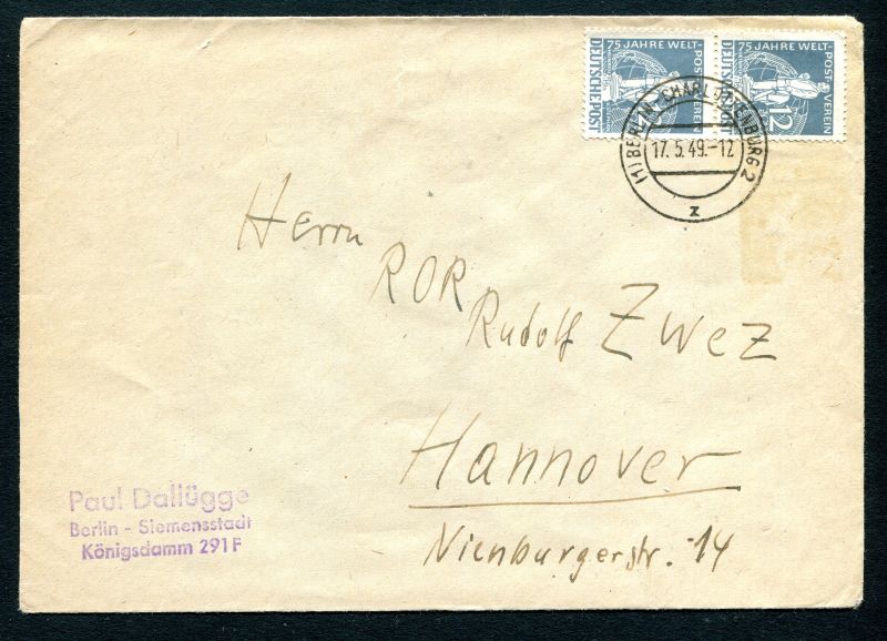 1949 Mi.Nr. 35 , , senkrechtes Paar 12 Pfennig (UPU) ab Berlin - Charlottenburg 2, am 17.5.49 nach Hannover. Mi. 60.-- Euro.