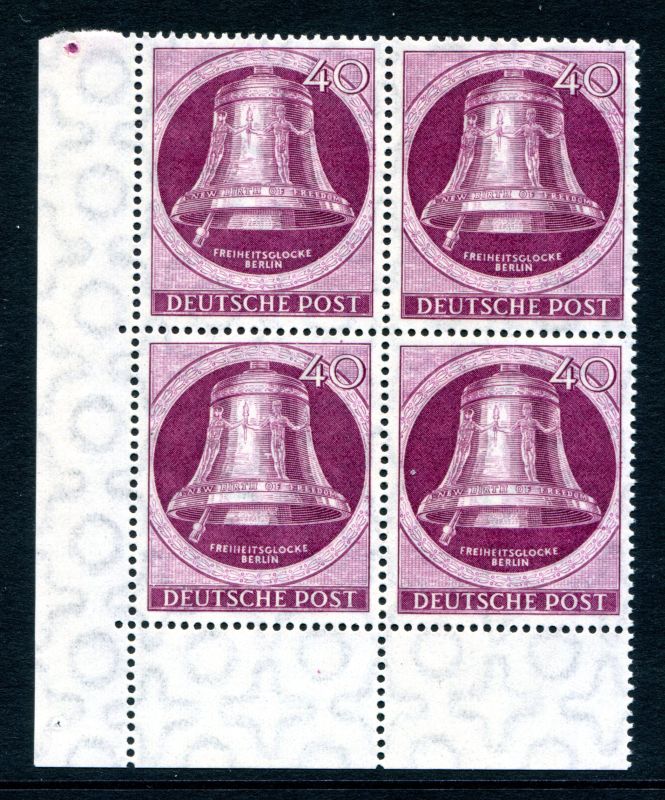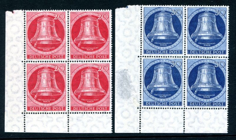1951 Mi.Nr. 75/79 , , Glocke Klöppel links, alle 5 Werte aus der Bogenecke links unten. Bei der 30 Pfennig Haftstelle am Seienrand. Mi.(400.--)Euro.