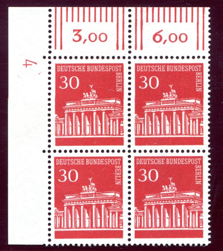 1966 Mi.Nr. 288 , , 30 Pfennig Brandenburger Tor, Bogenecke oben links mit (DZ) 4 im Viererblock.