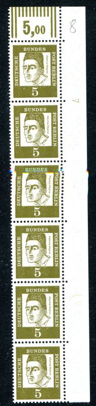 1961 Mi.Nr. 199 , , 5 Pfennig Bedeutende Deutsche, Bogenecke oben rechts im 6er Streifen mit (DZ) 7