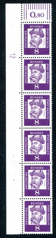 1961 Mi.Nr. 201 , , 8 Pfennig Bedeutende Deutsche, aus der Bogenecke oben links im 6er Streifen mit (DZ) 12