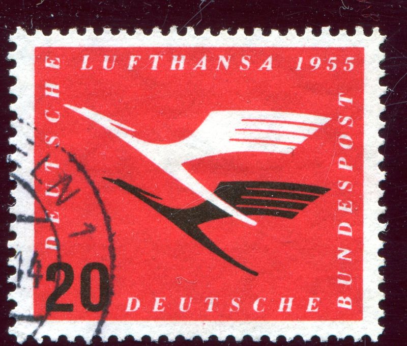 1955 Mi.Nr. 208 , 20 Pfennig Lufthansa mit Plattenfehler (E) von Deutsche unten offen. Im Mi. noch nicht bewertet.