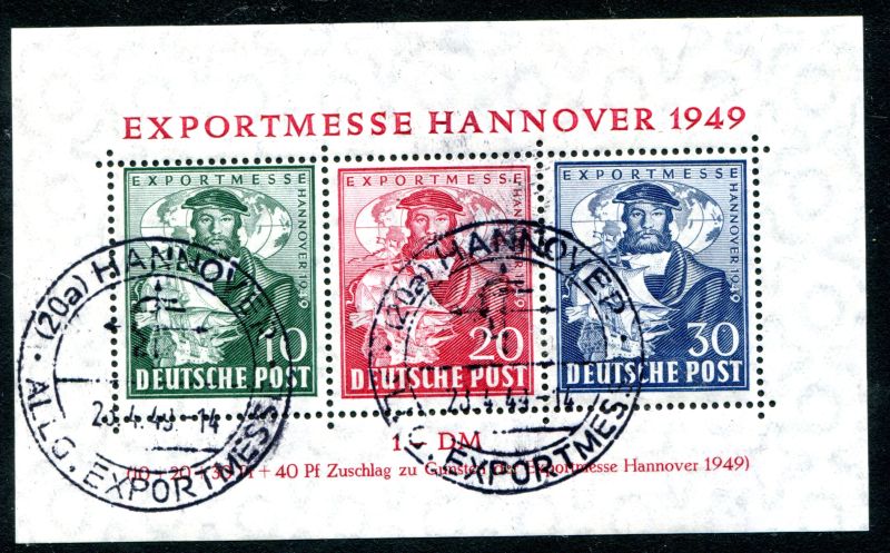 1949 Block 1 , Exportmesse Hannover mit 2 Messe - Sonderstempel vom 23.4.49 Mi. 250.-- Euro.