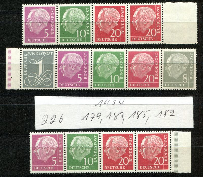 1954 Mi.Nr. aus 179, 183, 182, 185, 226. Drei Heuss - Streifen , liegendes Wz.