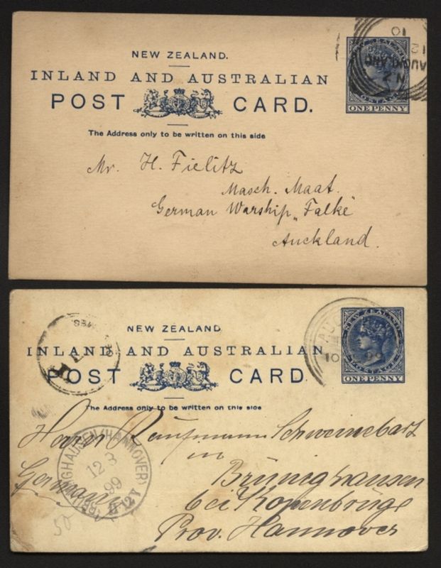 1895 und 1899 Australien. 2 Ganzsachenkarten echt befördert, 1 mal nach Aukland und 1 mal nach Brünnighausen bei Hannover.
