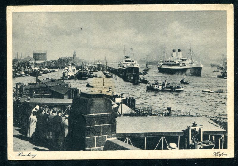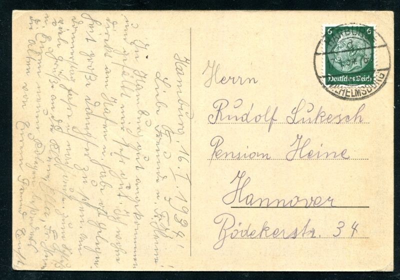 1934 Schiffe im Hamburger Hafen und Landungsbrücke, frankiert mit D.R. Hindenburg. Tagesstempel Hamburg 17.1.34 befördert nach Hannover. Nr. 7067