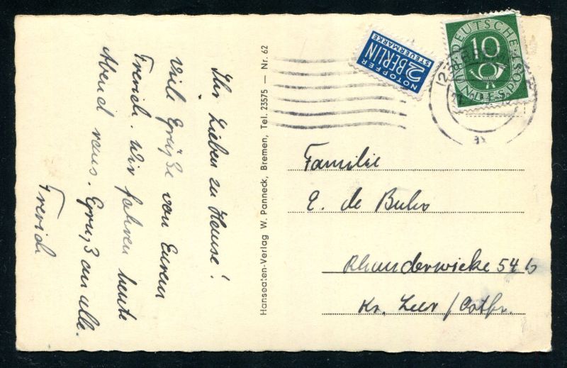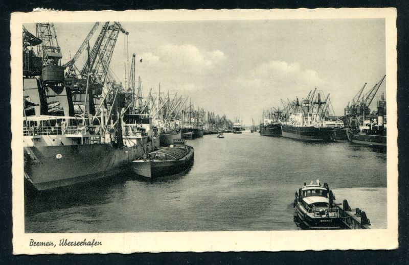 1953 Bremen, Überseehafen div. Schiffe am Anleger, befördert nach Rhauderwieke. Nr. 7072