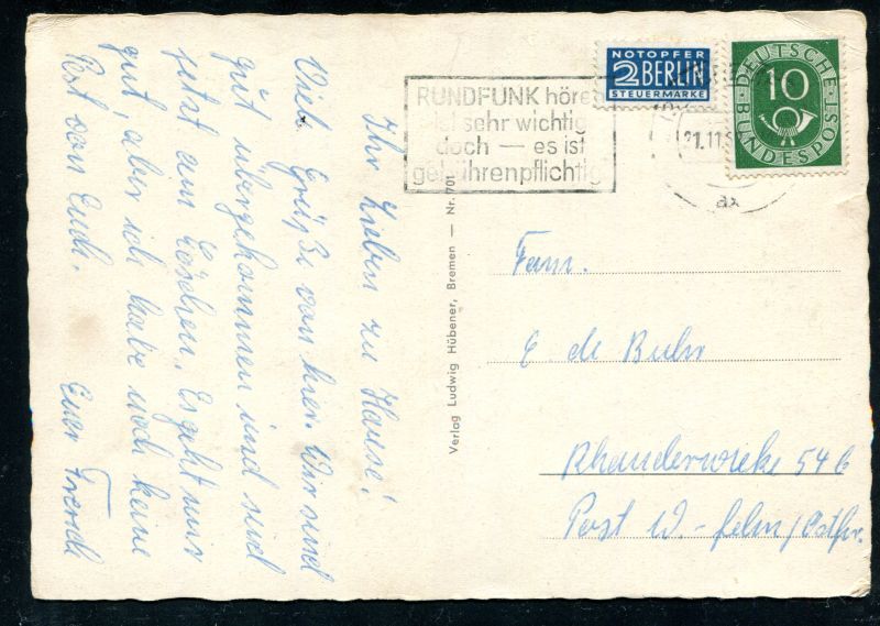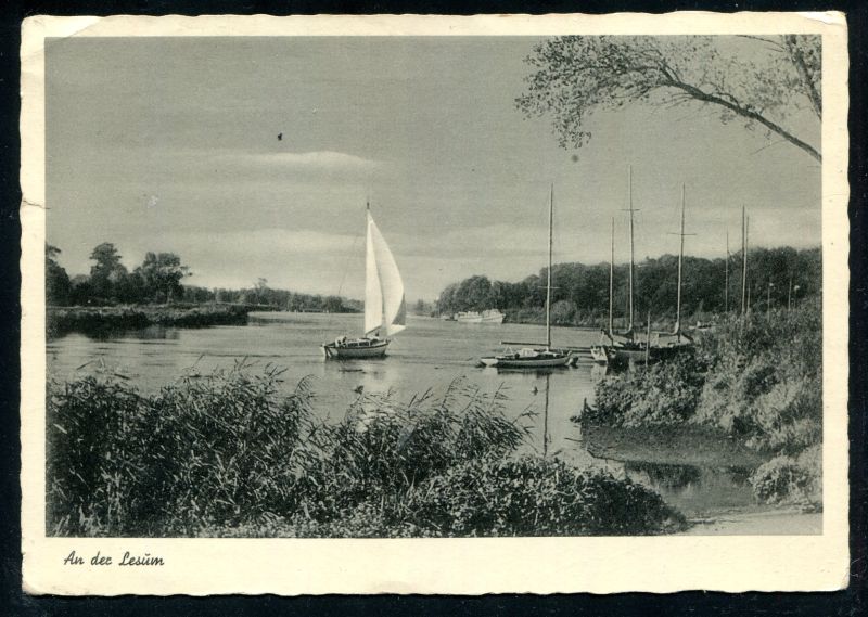 1952 An der Lesum, div. Segelschiffe und Frachtschiffe. Karte befördert nach Rhauderwieke. Oben leichter Eckbug. Nr. 7073