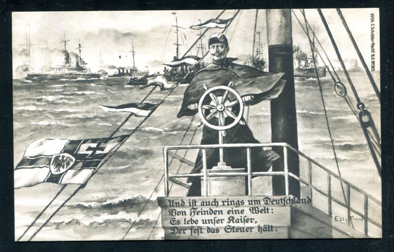 1. Weltkrieg. Kriegspostkarte ungebraucht. "Und ist auch rings um Deutschland von Feinden eine Welt: Es lebe unser Kaiser, der fest das Steuer hält." Nr. 7077