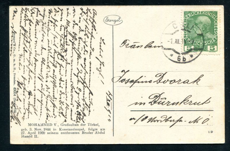 1914 Selbstbildnis AK Mohammed V. Großsultan der Türkei, echt befördert mit 5 Heller Österreich. In üblicher ERHALTUNG, siehe Scan. Nr. 7094