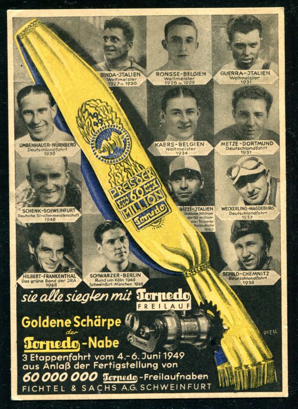 Um 1949 AK Torpedo Freilauf - Nabe der Fichtel und Sachs A.G. Schweinfurt. Mit Goldene Schärpe und Foto der Weltmeister und Sieger ab 1927 bis 1948 in ungebrauchter guter Erhaltung, siehe Scan. Wird selten angeboten. Nr. 7097