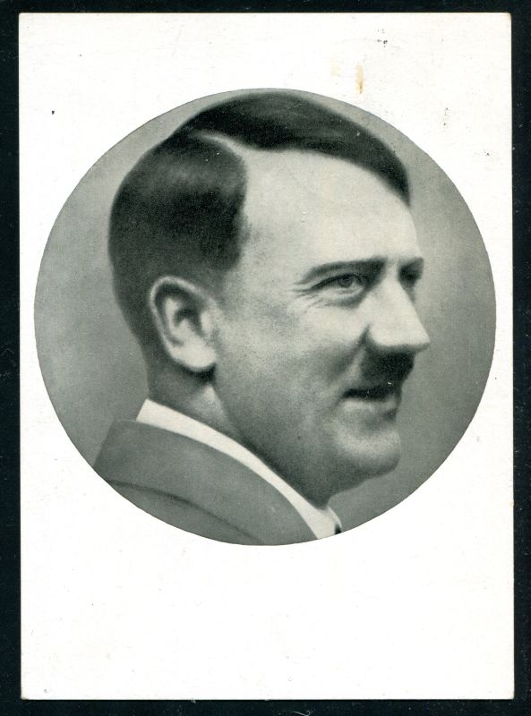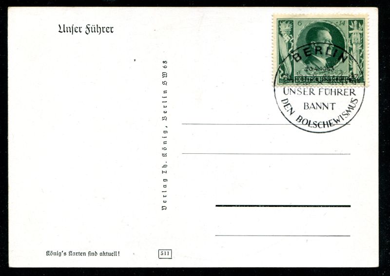 Adolf Hitler Reichskanzler. Selbstbildnis. Sonderkarte mit Sonderstempel Berlin 20.4.43 "Unser Führer bannt den Bolschewismus". Photo Verlag König Berlin. Nr. 8008