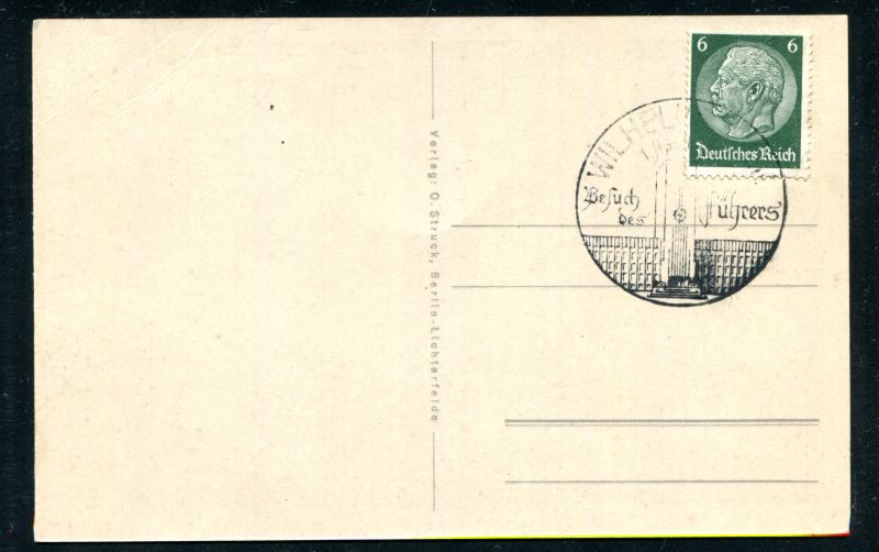 Adolf Hitler Reichskanzler. Selbstbildnis. Sonderkarte mit Sonderstempel Wilhelmshaven 1. April Besuch des Führers. Verlag O. Struck Berlin. Nr. 8011