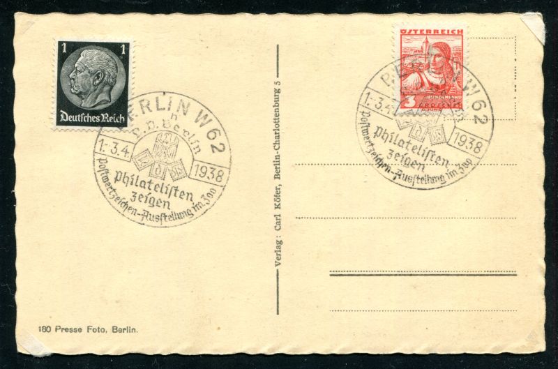 Adolf Hitler Reichskanzler. Selbstbildnis. Sonderkarte mit 2 Sonderstempel auf 2 Marken Berlin W 62 1.-3.4.1938 Philatelisten zeigen. Presse Foto Nr. 180 Berlin. Nr. 8014