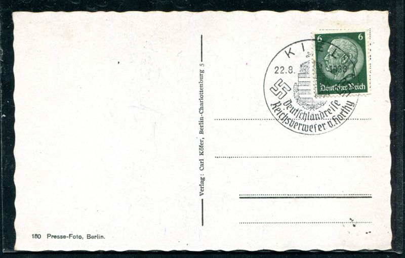 Adolf Hitler Reichskanzler. Selbstbildnis. Sonderkarte mit Sonderstempel auf 1 Marken Hindenburg, KIEL 22.8.1938 Deutschlandreise Reichsverweser v. Horthy. Presse Foto Nr. 180 Berlin. Nr. 8015