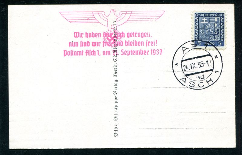 Adolf Hitler Reichskanzler. Selbstbildnis. Sonderkarte mit ASCH 24.IX.38 und roter Stempel ROTER ADLER Wir haben das Joch getragen nun sind wir frei und bleiben frei! Postamt Asch 1, am 21. September 1938. Bild 5 Fotos Otto Happe Berlin. Nr. 8017