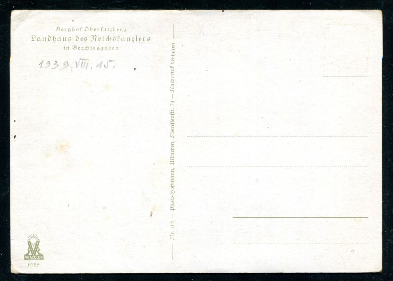 1939 Berghof Obersalzberg. Landhaus des Reichskanzlers in Berchtesgaden 15.8.1939 ungebraucht. Foto Nr. 162 Hoffman München. Nr. 8022
