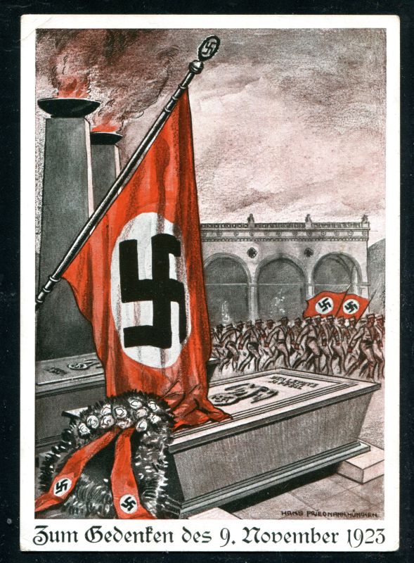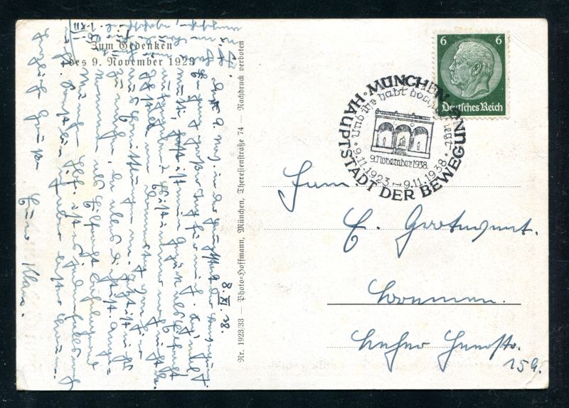 1938 Zum Gedenken des 9. November 1929 frankiert mit 6 Pf. Hindenburg und Sonderstempel München Hauptstadt der Bewegung. 9. November 1938. Und Ihr habt doch gesiegt, echt befördert. Foto Hoffmann München. Nr. 8024