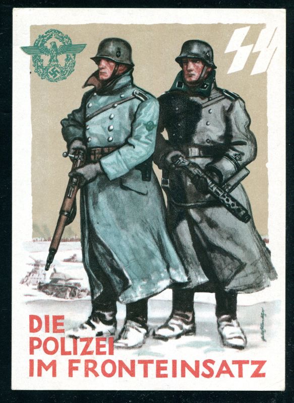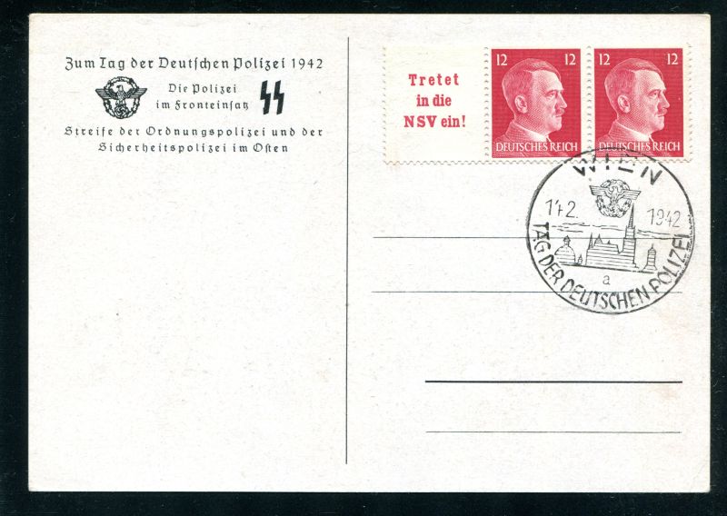 1942 zum Tag der Deutschen Polizei 1942. Die Polizei SS im Fronteinsatz. Streife der Ortnungs Polizei und der Sicherheits Polizei im Osten, frankiert mit Hitler Zusammendruck Mi.Nr. W157 mit A15.2 788788 2 Marken mit Sonderstempel WIEN 14.2.1942 Tag der Deutschen Polizei. Nr. 8031