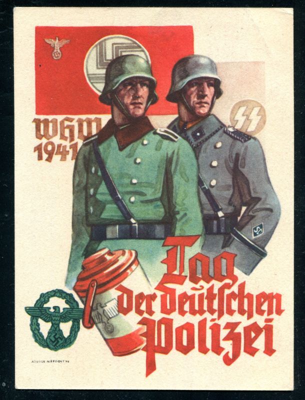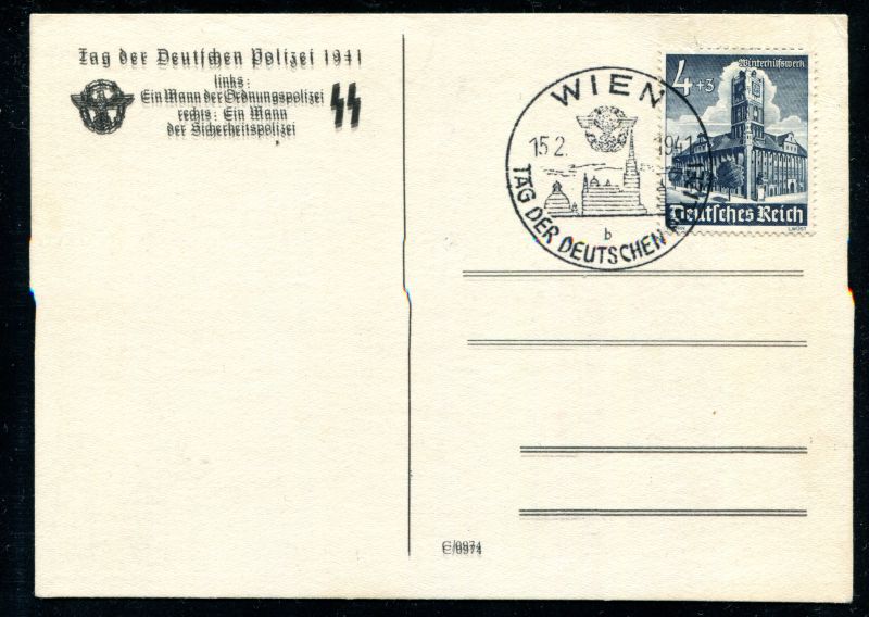 1941 WhW Tag der Deutschen Polizei. Mit Doppeldruck auf der Rückseite. "Tag der Deutschen Polizei 1941 links: Ein Mann der Ordnungspolizei, rechts: Ein Mann der Sicherheitspolizei", frankiert mit D.Reich Mi.Nr. 752 mit Sonderstempel WIEN 15.2.1941 Tag der Deutschen Polizei. Nr. 8032