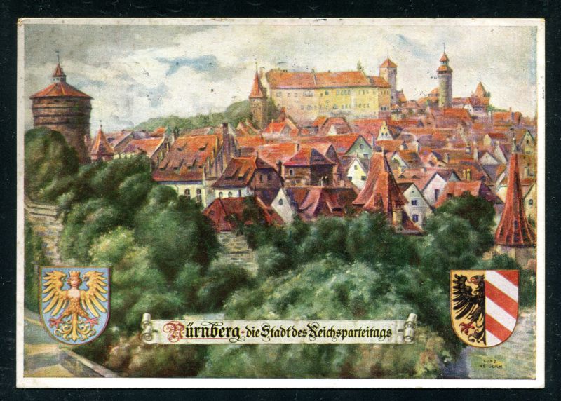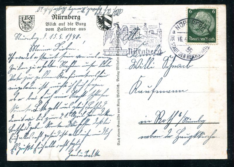 1940 NÜRNBERG die Stadt des Reichsparteitags. Blick auf die Burg vom Hallertor aus, frankiert mit 6 Pfennig Hindenburg und Maschinenstempel Nürnberg 16.4.1940 echt befördert. Nr. 8034