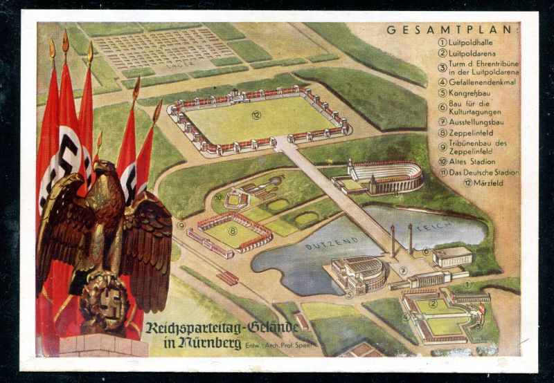 Das Reichsparteitags Gelände in Nürnberg. Gesamtplan von Luitpoldhalle bis Märzfeld, ungebraucht. Nr. 8035
