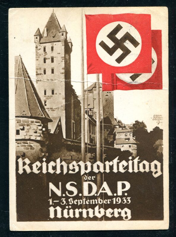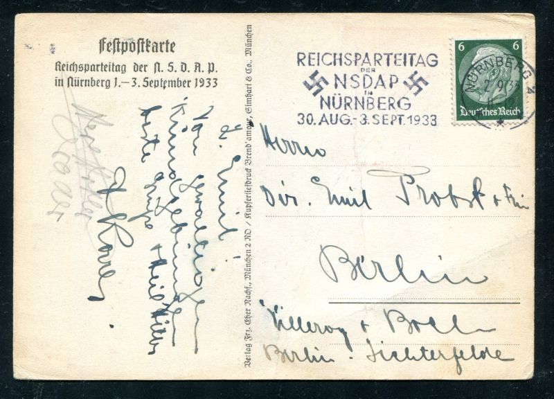 1933 Reichsparteitag der NSDAP. 1.-3. September 1933 in NÜRNBERG, frankiert mit 6 Pfennig Hindenburg mit Maschinenstempel entwertet am 2.9.1933 der NSDAP, echt befördert nach Berlin. Nr. 8036