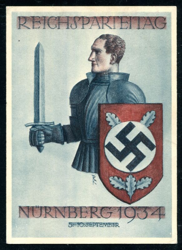 1934 Nürnberg, die Stadt der Reichsparteitage. Festpostkarte zum Reichsparteitag der NSDAP vom 5.-10. September 1934 mit D.Reich Marke Mi.Nr. 546 und Nürnberger Maschinenstempel der NSADP, echt befördert nach CASTROP - CRAUXEL. Nr. 8038
