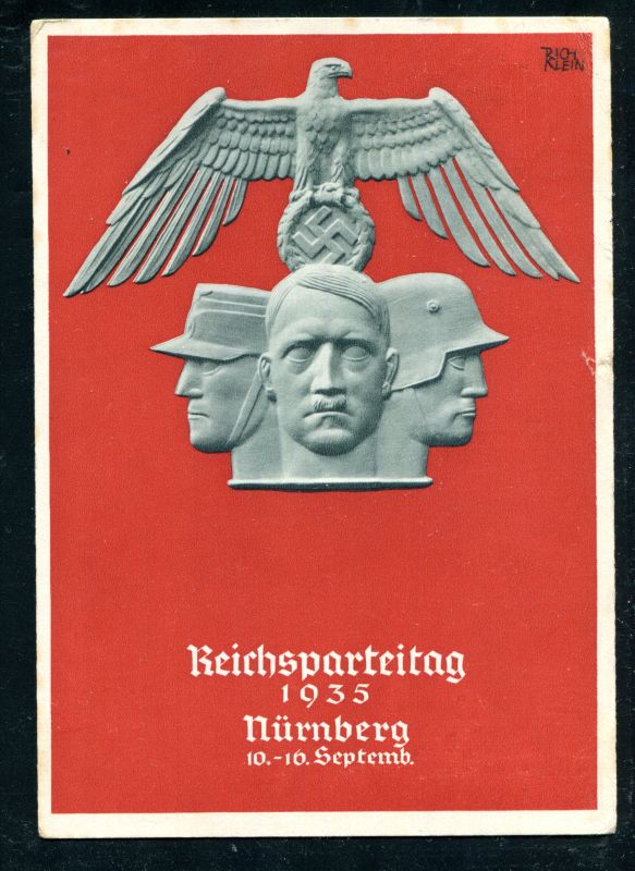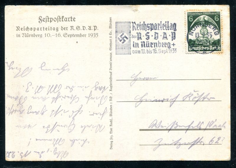 1935 Reichsparteitag Nürnberg 10.-16 September 1935 Festpostkarte der NSDAP IN NÜRNBERG, mit D.Reich Marke Mi.Nr. 586 und Nürnberger Maschinenstempel der NSDAP vom 13.9.35 echt befördert. Nr. 8040