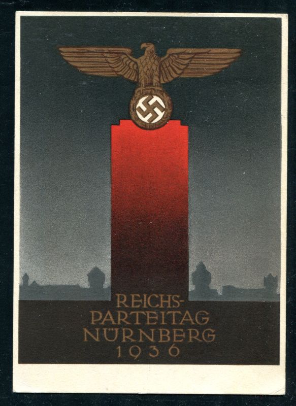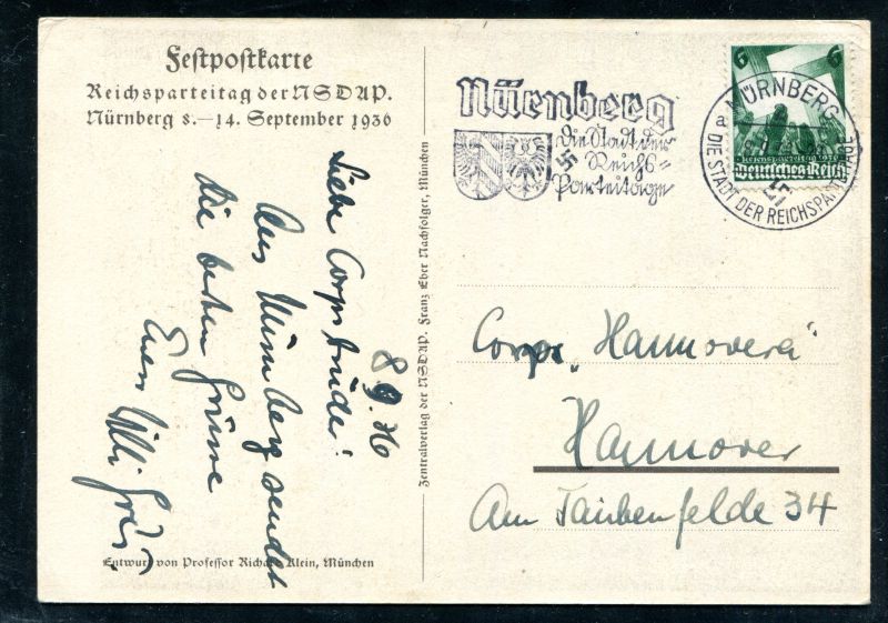 1936 Reichsparteitag Nürnberg 8.-14 September 1936 Festpostkarte Reichsparteitag der NSDAP IN NÜRNBERG, frankiert mit D.Reich Mi.Nr. 632 und Nürnberger Maschinenstempel zum Parteitag der NSDAP vom 8.9.36 befördert nach Hannover. Nr. 8045