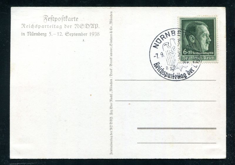 1938 Reichsparteitag Nürnberg 5.-12 September 1938 Festpostkarte Reichsparteitag der NSDAP IN NÜRNBERG, frankiert mit D.Reich Mi.Nr. 672 und Nürnberger Sonderstempel vom 7.9.36 nicht befördert. Nr. 8046