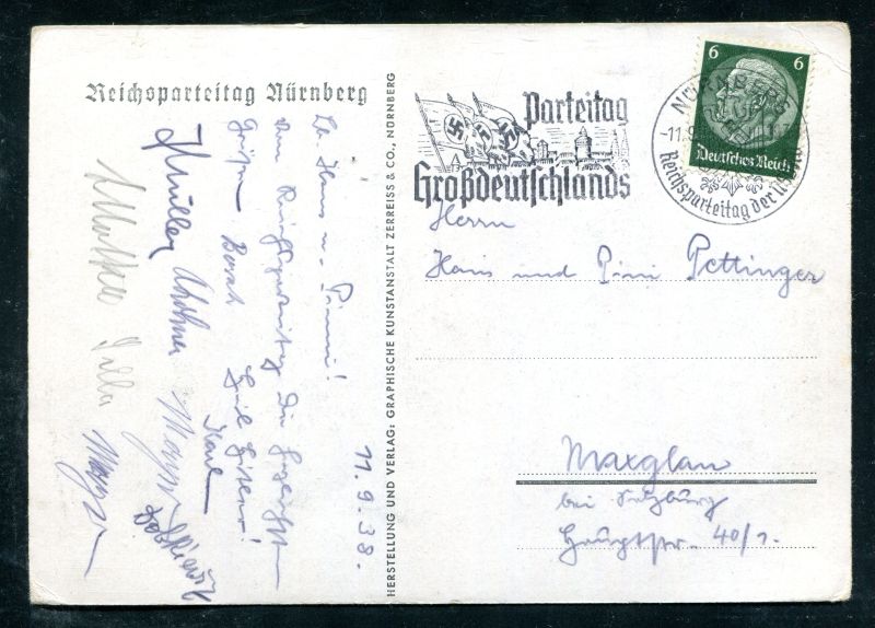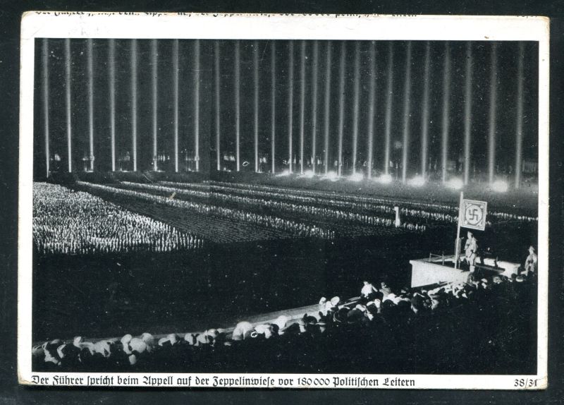 1938 Reichsparteitag Nürnberg. mit passendem Stempel vom 11.9.38 Nürnberg auf 6 Pfennig Hindenburg echt befördert. Ansicht: Der Führer spricht auf der Zeppelinwiese vor 180 000 Politischen Leitern. "Die Karte ist am Oberrand breiter geschnitten". SELTEN. Nr. 8049