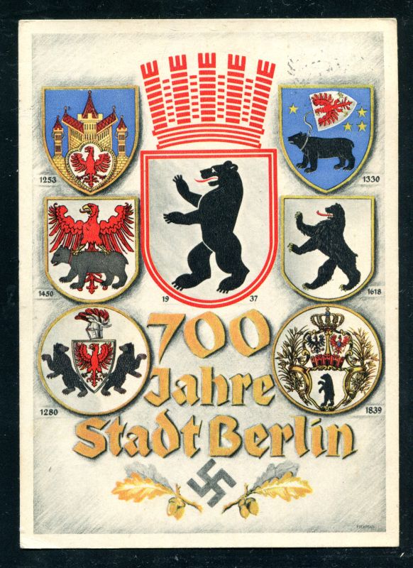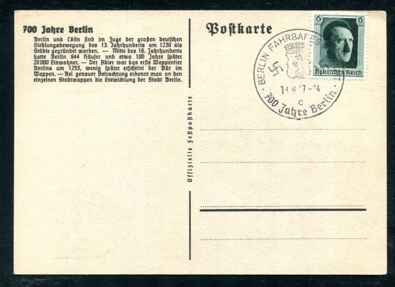 1937 700 Jahre Stadt Berlin. (Mit Texteindruck) und Sonderstempel BERLIN FAHRBARES POSTAMT 18.8.37 700 Jahre Berlin auf 6 Pfennig HITLER. Nicht befördert. Nr. 8052