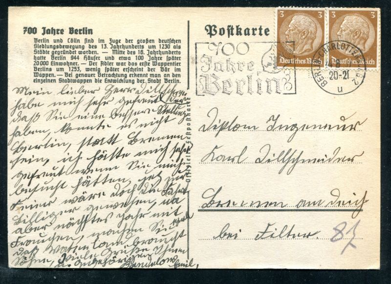 1937 700 Jahre Stadt Berlin. (Mit Texteindruck) und Sonderstempel BERLIN SCHARLOTTENBURG 2 24.8.37 700 Jahre Berlin auf 2 MARKEN 3 Pfennig HINDENBURG. Echt befördert. Nr. 8053