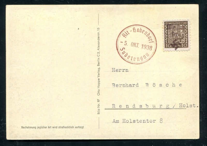1938 Heimkehr in das ALTREICH: Saarland / Österreich / Sudetenland. "Ein Volk - Ein Reich - Ein Führer", Marke Tschechoslowakei und Aufdruck "Wir sind frei" und brauner Sonderstempel "Alt Habendorf 5. Okt. 1938 Sudetengau", echt befördert nach Rensburg. Nr. 8054