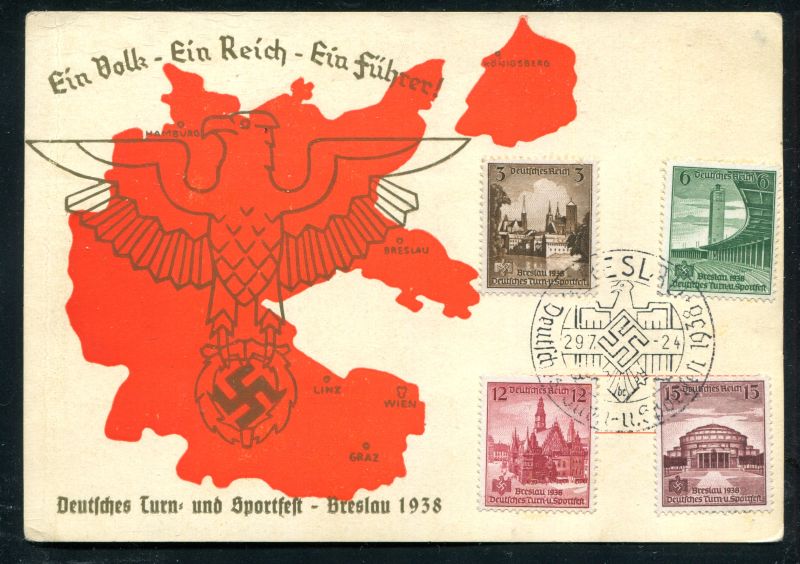 1938 Großdeutschland Heimkehr in das ALTREICH: Saarland / Österreich / Sudetenland. "Ein Volk - Ein Reich - Ein Führer", Deutsches Turn- und Sportfest - Breslau 1938. Markensatz 665/68 Sportfest Breslau, mit Sportfest - Sonderstempel vom 29.7.1938 Nr. 8056