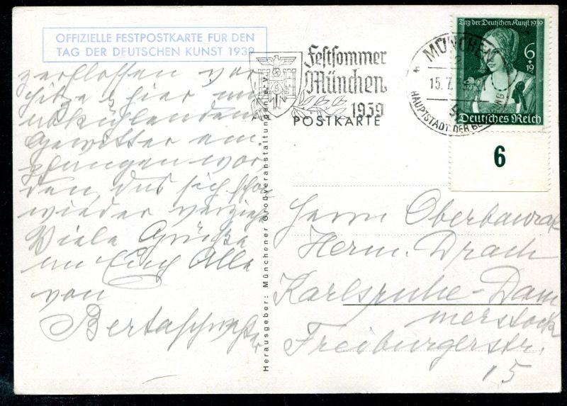 1939 Tag der Deutschen Kunst München 1939. Offizielle Festpostkarte mit passender Sondermarke R. Reich Mi.Nr. 700 und Sonderstempel München 14.7.1939 Hauptstadt der Bewegung, echt befördert nach Karlsruhe. Nr. 8063