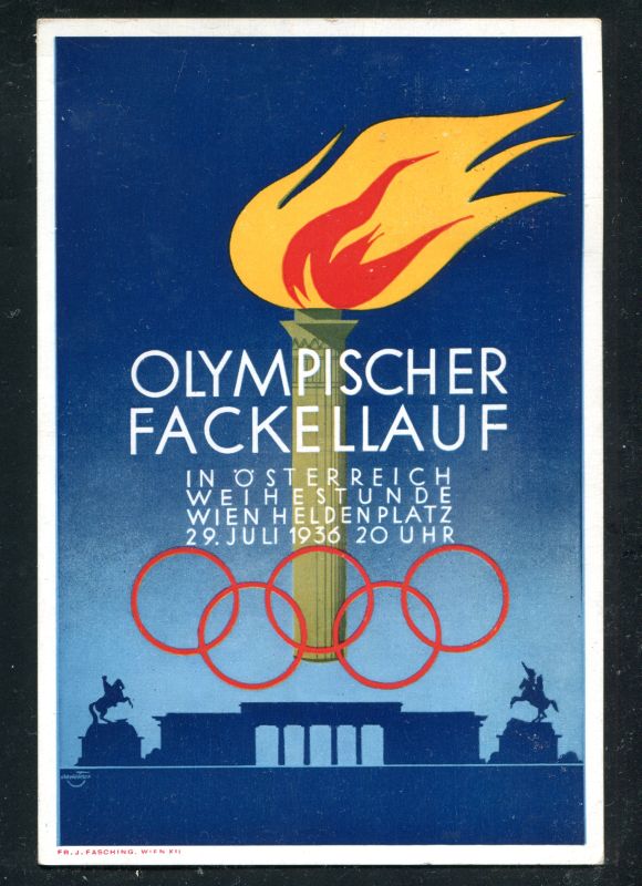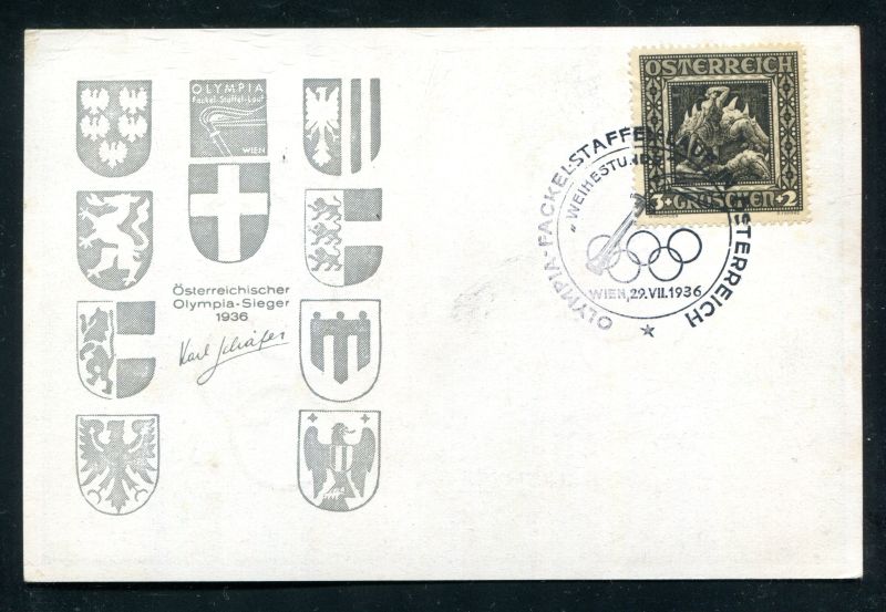 1936 Olympischer Fackellauf in Österreich Weihestunde Wien Heldenplatz 29. Juli 1936 20 Uhr. Mit Sondermarke Österreich Mi.Nr. 488 und passenden Olympia - Sonderstempel Wien 29.VII.1936 939. Sonderkarte. Nr. 8066