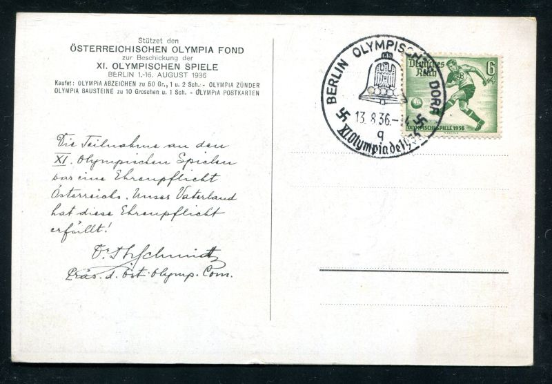 1936 XI. Olympische Spiele Berlin 1.-16. August 1936. Sonderkarte frankiert mit D.Reich Mi.Nr. 611 Sportmarke und Sondertempel "Berlin Olympisches Dorf 13.8.36 XI. Olympiade 1936". Nr. 8068