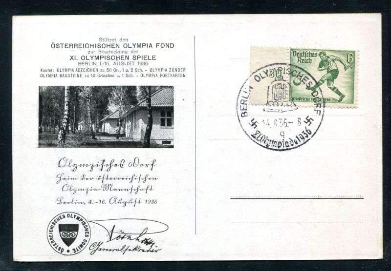 1936 XI. Olympische Spiele Berlin 1.-16. August 1936. Sonderkarte Rückseite mit Abbildung Olympisches Dorf der Österreichischen Mannschaft, frankiert mit D.Reich Mi.Nr. 611 Sportmarke und Sonderstempel "Berlin Olympisches Dorf 13.8.36 XI. Olympiade 1936". Nr. 8069