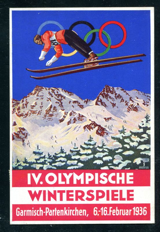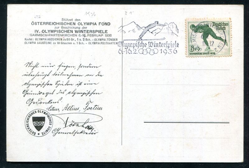 1936 IV. Olympische Winterspiele Garmisch-Partenkirchen, 6.-16.Februar 1936. Sonderkarte frankiert mit D.Reich Mi.Nr. 600 Sportmarke und olympischer Maschienenstempel "GARMISCH-PARTENKIRCHEN 6.-16.2.1936 IV. OLYMPISCHE WINTERSPIELE. Nr. 8072