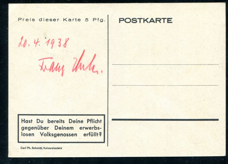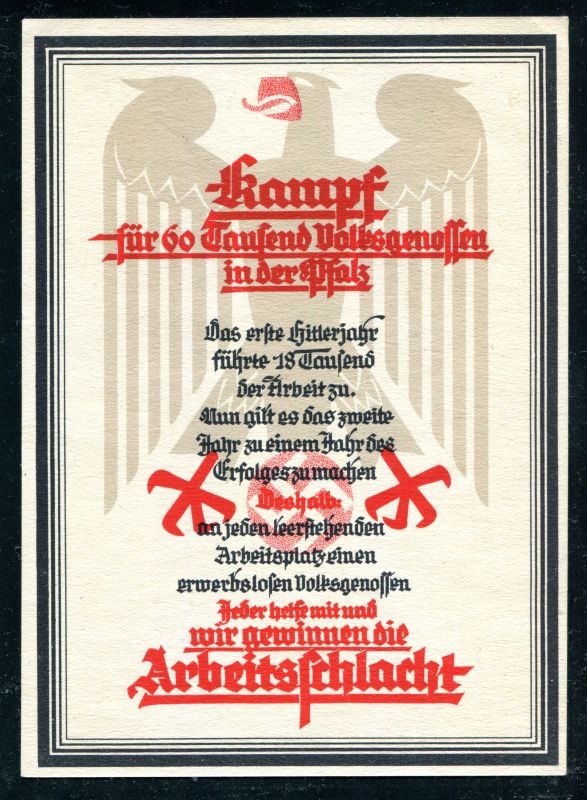 1938 Kampf für 60 Tausend Volksgenossen in der Pfalz. "Jeder helfe mit und wir gewinnen die ARBEITSSCHLACHT. Nr. 8083