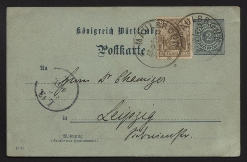 LIQUIDATIONSPOSTEN. Ganzsache Württemberg mit Zusatzfrankatur Deutsches Reich Nr. 69a, ab Maulbronn nach Leipzig.