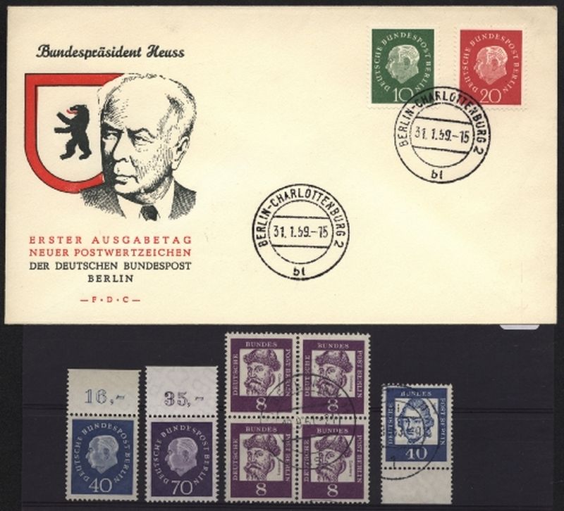 1959 bis 1961 Zusammenstellung Mi.Nr. 183/84 auf FDC, 185/86 40 und 70 Pfennig Heuss 3 mit Oberrand, 201 im , 207 mit Unterrand gefaltet.