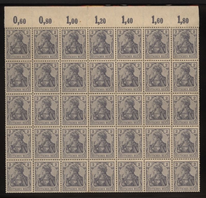 LIQUIDATIONSPOSTEN. 1905 bis 1913 Mi.Nr. 83I , 2 Pfennig Germania, 70 Marken im Bogenteil mit 7 Marken vom Oberrand. Mi.(420.--)Euro.