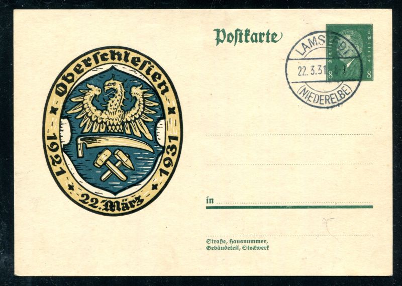 P 190 Ganzsache, Postkarte. Oberschlesien, Tagesstempel Lamstedt 22.3.31 Nr. 9004