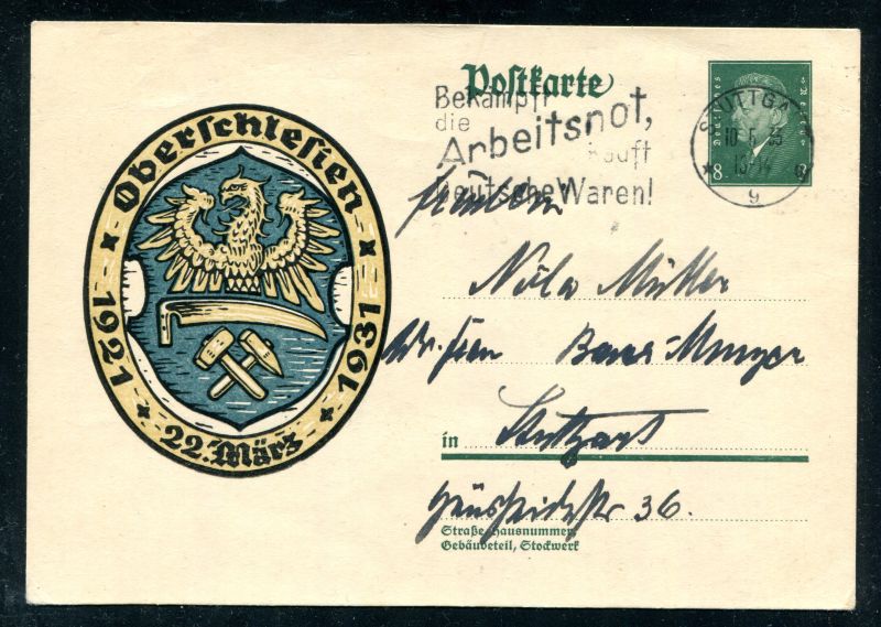 P 190 Ganzsache, Postkarte. Oberschlesien, echt befördert Tagesstempel ab Stuttgart 10.5.33 nach Stuttgart. Nr. 9007