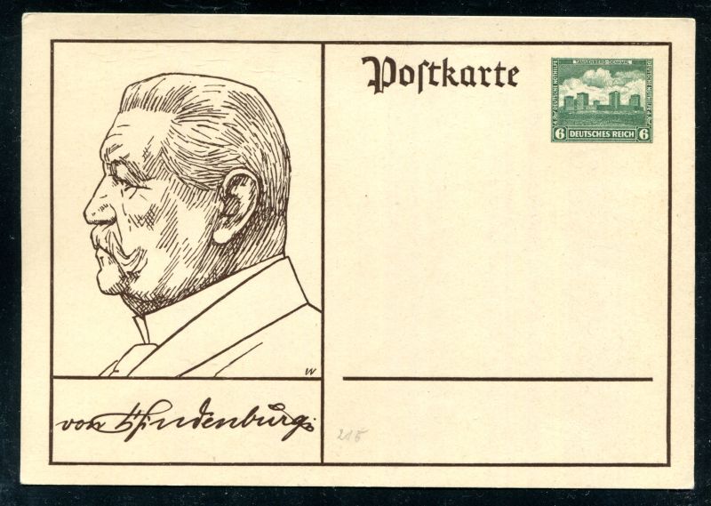 P 215 Ganzsache, Postkarte, Hindenburg, Tannenberg Denkmal, Nothilfe, ungebraucht. Nr. 9022