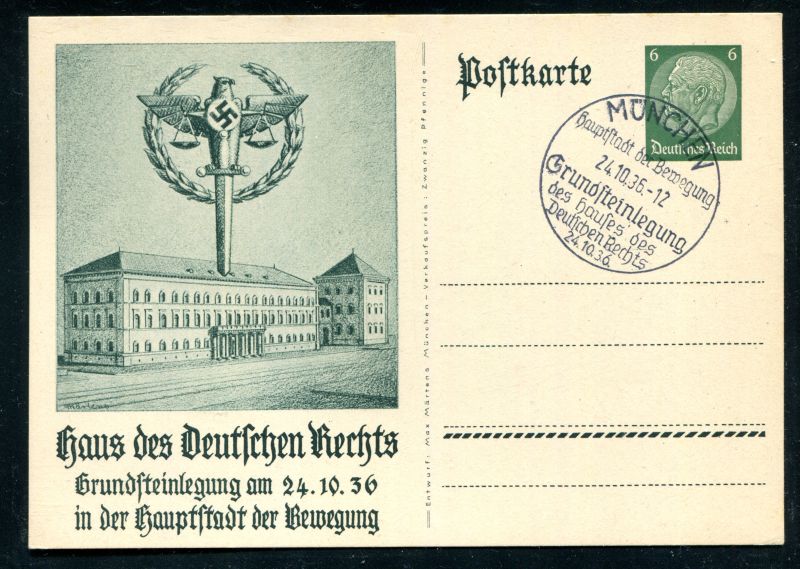 P 237 Ganzsache, Postkarte, 1936 Haus des Deutschen Rechts. Grundsteinlegung am 24.10.36 in der Hauptstadt der Bewegung München, mit Sonderstempel München 24.10.36 Grundsteinlegung. Nr. 9035