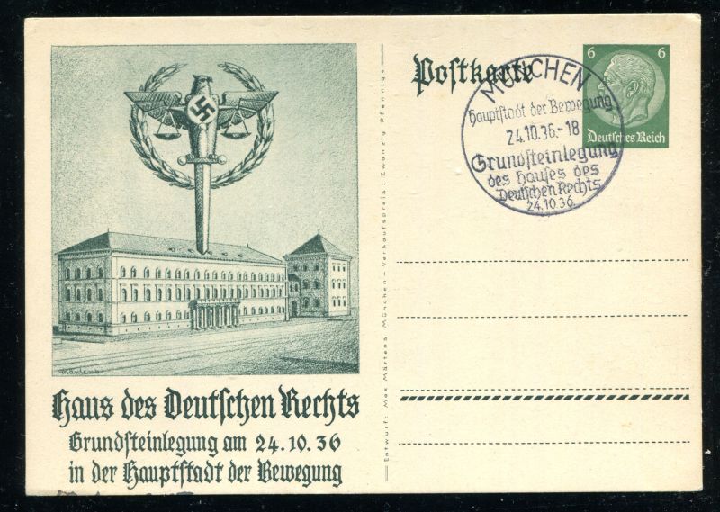 P 237 Ganzsache, Postkarte, 1936 Haus des Deutschen Rechts. Grundsteinlegung am 24.10.36 in der Hauptstadt der Bewegung München, mit Sonderstempel München 24.10.36 Grundsteinlegung. Nr. 9036